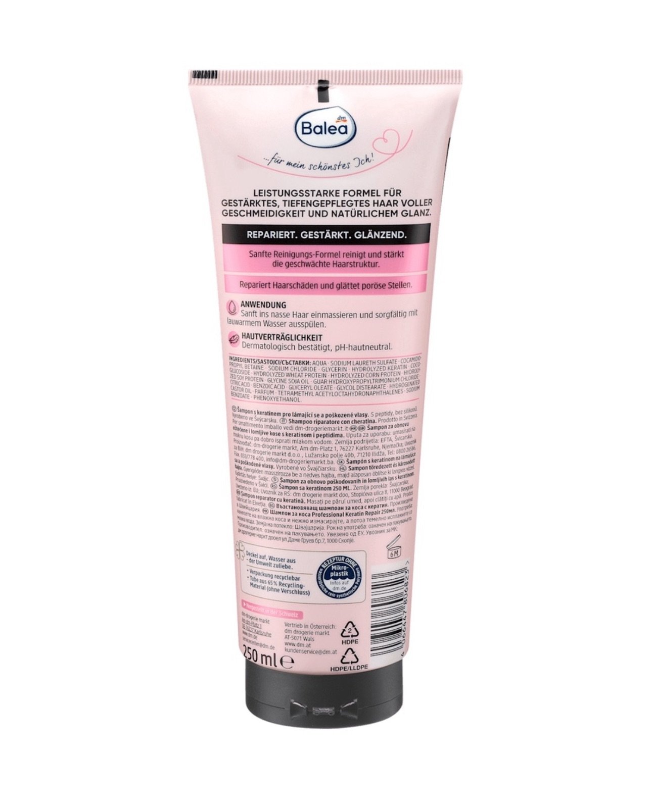 Domptez, lissez et réparez vos cheveux avec le Shampooing à la Kératine de Balea Professional (gamme « Keratin Repair » ou « Glatt »), disponible chez Bel DM au Maroc. Ce shampooing est conçu pour les cheveux abîmés, cassants ou difficiles à lisser. La Kératine, protéine naturelle du cheveu, est ici sous forme de phyto-kératine pour combler les brèches de la fibre capillaire. Il nettoie en douceur tout en commençant le processus de réparation : il renforce la structure du cheveu, lisse la cuticule, réduit les frisottis et améliore la brillance. C’est le shampooing idéal pour entretenir un lissage ou pour faciliter le brushing. Retrouvez des cheveux plus forts et soyeux grâce à ce produit DM authentique de Bel DM.