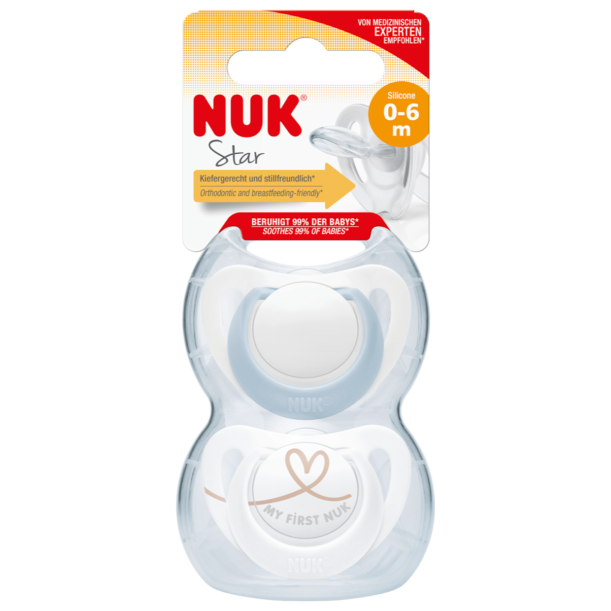 Sucette en silicone NUK Star, bleu/blanc, taille 1, 0-6 ans…, 2 pièces